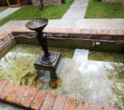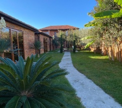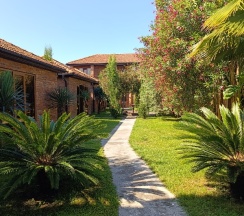 В номере есть всё необходимое. Во дворе дома очень живописно, фонтан с рыбками и фруктовый сад. Гостиница расположена в частном секторе.