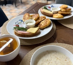 В номерах чисто, есть гигиенические наборы, тапочки. Завтраки не шведский стол, а подают завтрак по меню, каждый день разное, меню расположено в номере, что очень удобно, ты можешь посмотреть заранее что будет на завтрак. На этаже есть чайник и кулер с водой. На ресепшене нас встретила очень приветливая женщина. Всё супер, рекомендую для выбора к проживанию!