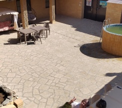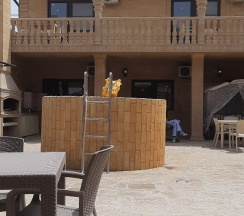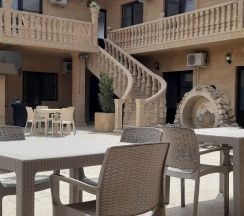 Сам гостевой дом построен из такого материала, что даже в сильную жару сохраняет прохладу, к тому же в дополнение ко всему в каждом номере кондиционер, холодильник, стол со стульями, чайник. Окна выходят во дворик, который наполнен уютом с тёплой купелью, качельками и фонтанчиком. Данный гостевой дом имеет два источника электропитания, что в сильную жару очень хорошо, так как всегда есть свет и работают кондиционеры, даже в сравнении с соседними отелями.