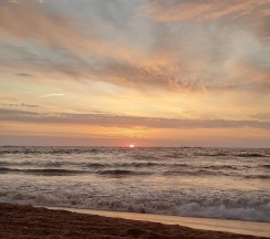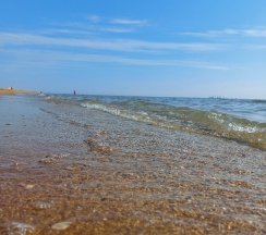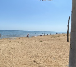 Море прям через дорогу. Пляж малозагруженный, море чистое, вода теплая. Берег песчаный и пологий,что очень удобно для отдыха с детьми.