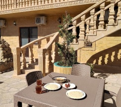 ( каша, масло, яйца, сыр, лепешки)Гостеприимные хозяева, обстановка как дома. Тем кто читает отзывы о воде, поясняю, вода подается прямо из источника, бесплатные сероводородные ванны). Хозяйка готовит очень вкусные национальные блюда по приемлемой цене. Хороший гостевой домик, море в шаговой доступности.Хозяин решает любую проблему по проживанию и сам возим на экскурсии( быстро и цена радует). Всем рекомендую!