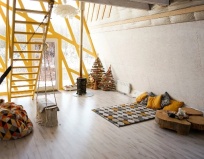 Очень интересный интерьер, есть занятные предметы (столы из спилов деревьев, подставка под чайник и другие)
