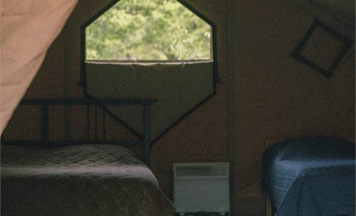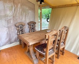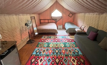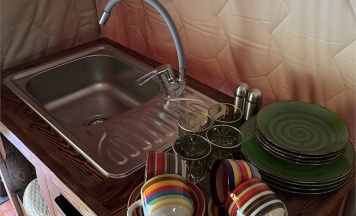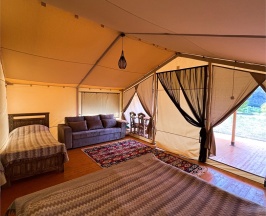 Комфортабельный глэмпинг вместимостью до 5 человек. С удобствами внутри. В глэмпинге: двуспальная , односпальная кровати с ортопедическими матрасами, раскладной диван. Все необходимое для комфортного проживания: набор посуды на пять персон, минибар, электрический чайник, полотенца, банные принадлежности.