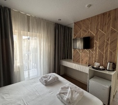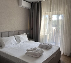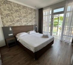 Очень хороший, достойный отель. Я осталась довольна пребыванием в данном отеле. Номер понравился, все исправно, все продумано, полотенца, халат, чайник, воду каждый день оставляли 0.5, чай, кофе. В ванной все необходимое есть. Уборка каждый день. Постель меняли. Интернет работал, иногда с перебоями, но сейчас везде перебои. Территория ухожена, все красиво, никакого шума и громкой музыки. Персонал дружелюбный и отзывчивый, спасибо! Питалась сама, есть пятерка в километре, пройтись не проблема. В округе есть пару столовых, пару кафе . Море чистое, иногда были медузы, шторма не было, пляж хороший, места предостаточно, на пляже есть платные лежаки 500 р. , есть передевалки, прокат сабборда. Тихий, спокойный отдых!