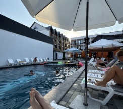 Сняли номер ради теплого бассейна) были в декабре, в нашем отеле рядом не было бани и бассейна и решили на денек заселиться сюда. Персонал вежливый, отель новый, территория ухоженная, красивая. Рядом есть стройка, но как-то не особо на это обращаешь внимание. Из плюсов - хороший новый хамам (внутри ничем не пахнет, как бывает в старых хамамах), красивый бассейн! Сауна показалась прохладной. Из минусов: в хамаме не работает (вернее отсутствует ) поливалка - чтобы сполоснуть место от предыдущего человека. Бассейн остыл быстро и больше не нагревался. Когда заходили был прям теплый! Потом уже прохладнее, но все равно приятный и красивый)) все новенькое! Жирный минус (снимаю за это звезду) за то что нет ковриков и скользко в дождь и когда просто мокро - 2 человека упали на плитке. Будте аккуратнее. Потом нам постелили коврик. Но было больно и сейчас спустя 8 дней локоть до сих пор не зажил. В номерах очень жарко! Теплый пол работает активно! Открывали форточку ибо жара)) в целом ребята молодцы, кроме падения, нам все понравилось 😅 желаем вам развития и чтобы учли недочеты! Буду проездом, заеду к вам еще)