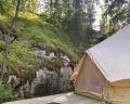 Место для глемпинга очень хорошо подобрано, место рядом со скалой очень красивое, можно подняться на скалу и посидеть на деревянном диване или покачаться на качели прям у края скалы.