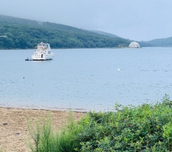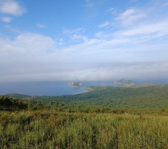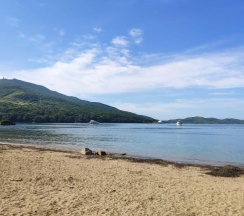 До моря 200 м. Дно песок. Берег ухоженный, газонная трава переходящая в песок. За сопкой заповедник, Можно туда для разнообразия, ничего особенного тоже море, тот же песок, только далеко от базы и магазина с холодными напитками.