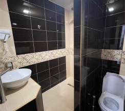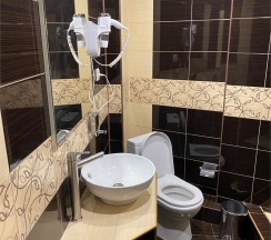 Уборная с душем и необходимыми принадлежностями. Наличие шторки для душа добавило бы идеальности. Полотенца и халаты в наличии, как и одноразовые тапочки. Можно погладить вещи, гладильная доска и утюг на этаже.