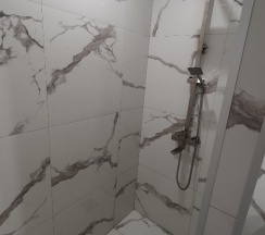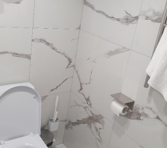 Уборная с душем и необходимыми принадлежностями. Наличие шторки для душа добавило бы идеальности. Полотенца и халаты в наличии, как и одноразовые тапочки. Можно погладить вещи, гладильная доска и утюг на этаже.