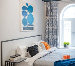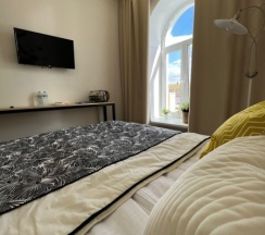 Номер-студио с максимальной вместимостью 4 человека, с мини-кухней, большой двуспальной кроватью, диваном-кроватью, собственной ванной комнатой, обеденной зоной, холодильником, микроволновкой, чайником. Номер с видом на город.