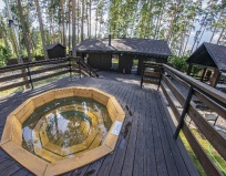Вокруг дома многовековые сосны, сам домик внутри пахнет новьем, дорогая мебель и техника, чувствуешь себя как будто-то день из жизни миллиардера, чан с гидромассажем просто сказка, будем вас рекомендовать