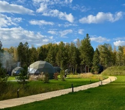 Очень красиво, природа, тропинки, ландшафтный дизайн. Зеркальные домики, тренажерка, купол со всеми удобствами. Обязательно приедем к вам ещё.