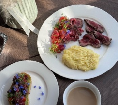 Ресторан далеко, пешком не вариант. Мы на обед добирались в ресторан на машине, на ужин жарили стейки на террасе домика, а завтрак могут принести прям в номер (но не скажу, что мы в восторге от завтрака 😁, фото приложила, смотрите сами, оценивать не буду), возможно, было бы лучше позавтракать в ресторане..