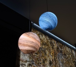 - Решение с кроватями: в домике-сфере кровать на первом этаже представляет собой раму из массива дерева с матрасом. Это красиво, но из-за небольшого размера домика деревянные торчащие части слегка травмоопасны, особенно в темноте. На верхнем уровне расположен матрас, который идет скорее как дополнительное спальное место.