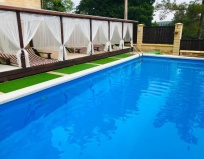 Атмосфера доброжелательная. Хороший чистый бассейн, детская площадка, летняя кухня, зона, зона для барбекю. Завтраки за отдельную плату, весьма вкусные и разнообразные. До моря пешком около 15 -20 минут, путь тенистый и гористый по началу.