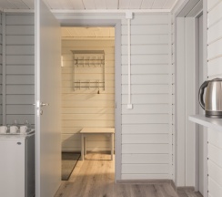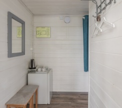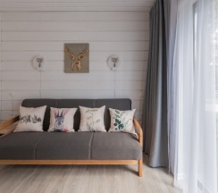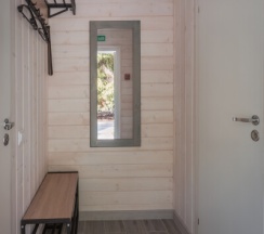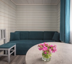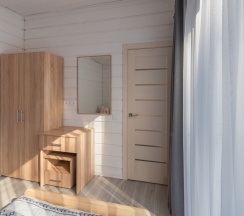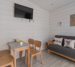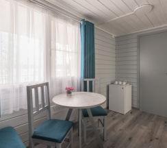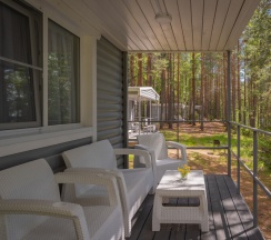 Двухкомнатный домик с отдельной гостиной и спальней. Здесь могут с удобством разместиться до четырёх гостей. Расположен домик всего в нескольких шагах от озера в окружении хвойного леса. В домике есть удобная мебелированная терраса, с которой открывается потрясающий вид на озеро. Здесь можно устраивать дружеские посиделки, наслаждаться рассветами и закатами и загорать в жаркие дни.