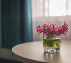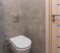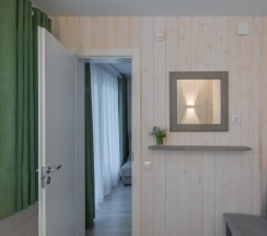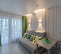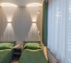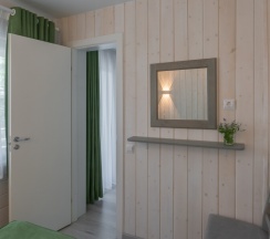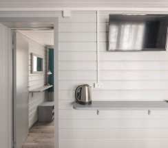Комплектация: две односпальные кровати или одна двуспальная кровать (по заявке), двуспальный диван, детская кроватка по запросу, тумбы, стол, стулья, холодильник, электрический чайник, телевизор, стеллаж, санузел с душем.