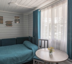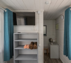 Комплектация: две односпальные кровати или одна двуспальная кровать (по заявке), двуспальный диван, тумба, стол, стулья, холодильник, электрический чайник, телевизор, стеллаж, санузел с душем.