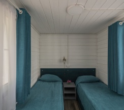 Комплектация: две односпальные кровати или одна двуспальная кровать (по запросу), двуспальный диван, детская кроватка по запросу, тумба, шкаф, обеденная зона, холодильник, электрический чайник, СВЧ-печь, столовая посуда, телевизор, санузел с душевой кабиной