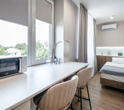 Отдыхали вдвоем с подругой с 06 по 13 июня 2025. Бронировали сильно заранее, как только появились цены на данный период. На сайте всё описано максимально достоверно. Современный интерьер, необходимое для полноценного проживания оборудование. Много посуды и кухонных принадлежностей. При возникшей необходимости были любезно предоставлены пиалы небольшого размера (в добавление к имеющимся большим). Утюгов на весь отель много (а не один на всех проживающих, как часто бывает), гладильная доска - в номере. Сантехника работала без проблем. Ресепшн с администратором нет, но управляющая всегда в доступе онлайн и оперативно реагирует на обращения. Wi-Fi в отеле предоставляется бесплатно. Расходные гигиенические материалы всегда в доступе на первом этаже. Матрасы современные средней жесткости, подушки нормальные, постельное белье отличное. Отличная и локация у отеля. Улица очень тихая, зеленая. Другие апарт-отели стоят на улицах с оживленным движением. "Лакколит 993" однозначно выигрывает по этому критерию. И в номере у нас было тихо, от соседей или из коридора шумы не поступали. Совсем рядом продуктовый Верхний рынок с фуд-кортом Кухни мира. Быстро можно дойти до бювета с минеральной водой (Источник №1) и до парка Цветник. Бесконтактное заселение/выселение происходит совершенно без проблем. Присылается подробное видео, что и как сделать, чтобы получить ключ. После выселения можно оставить багаж в запирающихся шкафчиках на -1 этаже. Может быть единственное замечание, справедливости ради, это отсутствие туалетной комнаты свободного доступа (после выселения). Думаю, это связано с тем, что отель очень небольшой. Таким образом, выражаю благодарность владельцам апартаментов и с чистой совестью могу рекомендовать данный апарт-отель к проживанию в Пятигорске.