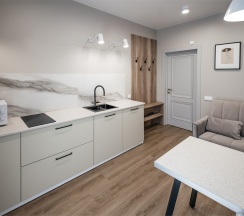 Замечательно! Очень красивый, продуманный интерьер. В номере есть гладильная доска, стиральная машина, варочная панель. Ремонт новый. В ванной теплый пол. Очень чисто: пол, посуда, ванная, все стеклянные и глянцевые поверхности. Одним словом - ВАУ! Если окажемся снова в Пятигорске - обязательно вернемся сюда.