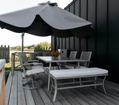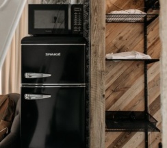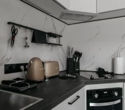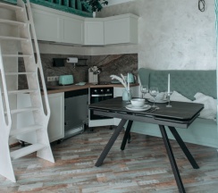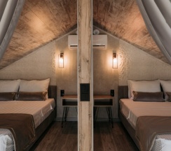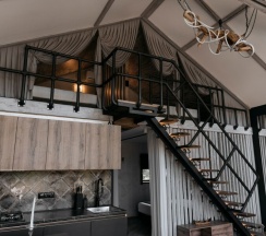 В доме уютно и просторно — 36 м2 площадь, а также лофт 8м2 и потолок 3,5 м + личная терраса 40 м2. В доме двуспальная кровать с белоснежным бельем, уютный лофт для маленьких непосед с широким двуспальным матрасом, кухня, оборудованная духовкой, микроволновкой, холодильником, посудомойкой и морозильной камерой, а также сервировочной посудой на 4х на любой случай, туалет, душ, стиральная машина, кондиционер, телевизор фен, Алиса и, конечно, большое панорамное окно с видом на реку и сосновый бор на холме. На террасе можно сидеть за столиком и говорить о прекрасном или загорать на личном песчаном островке, пока ваши малыши будут строить песочные замки прям рядом с вами. Для отделки и декора домика мы вдохновлялись мотивами природы карельского края. Пол и кухонный фартук напоминает нам о мраморных карьерах знаменитой Рускеалы. Отделка акцентной стены и окна выполнена из досок карельской сосны, стволы которой выловили в озерах этого края, а затем просушили на берегу под солнышком. В интерьере прослеживаются скандинавские нотки, что продиктовано близостью данного края к Финляндии. Вы обязательно прочувствуете весь природный колорит Карелии, который мы постарались подсветить в нашем уютном домике.