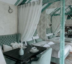 Для отделки и декора домика мы вдохновлялись мотивами природы Алтайского края. Пол и акцентные балки бирюзового цвета напоминают непередаваемое многообразие цветов, оттенков и переливов могучей реки Катунь. Отделка акцентной стены с зеркалом напоминает гладь множества озер Алтая. В зеркале отражается зелено-бирюзовая мебель, которая переносит в воспоминания о Гейзерном озере. В нашем доме «Голубая Катунь» Вы обязательно прочувствуете весь природный колорит Алтая, который мы постарались подсветить в нашем уютном домике.