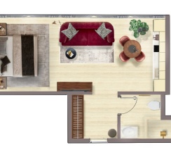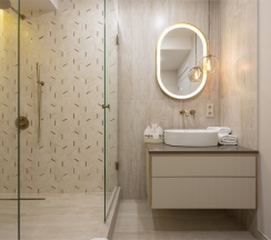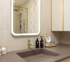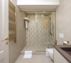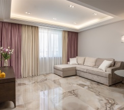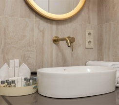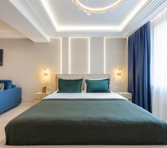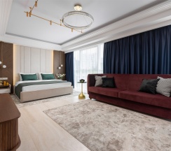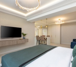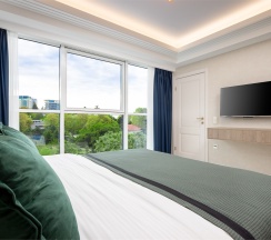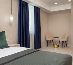 Номер "Люкс Премиум" – это 50 квадратных метров, где царит атмосфера уюта и вдохновения. Две комнаты, залитые золотом заката, станут вашим убежищем от суеты. Окна, обращенные к городу, дарят возможность наблюдать за его бурной жизнью, а частичный вид на море и порт навевают романтические грезы.
