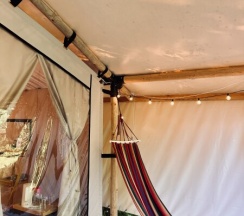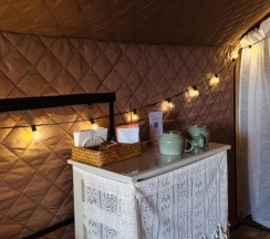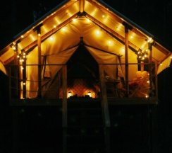 Сафари-тент с тёплым полом на возвышении и лесной горячий чан.