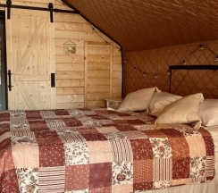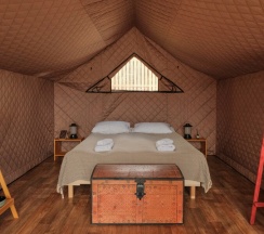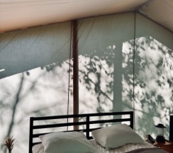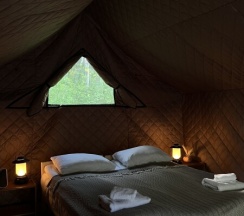 Уединенные сафари-тенты с панорамной входной зоной, тёплыми полами и видом на лес.
