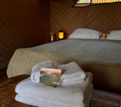 Номер с панорамной входной зоной на первой линии озера. В мае и сентябре можно любоваться перелётными птицами на озере, а летом купаться. Сафари-тент с тёплыми полами и утеплён сверху одеялом, поэтому находится внутри тепло даже при минусовой температуре.