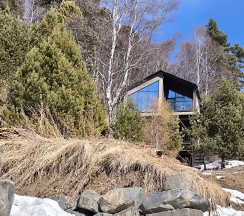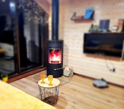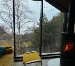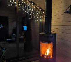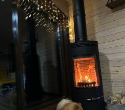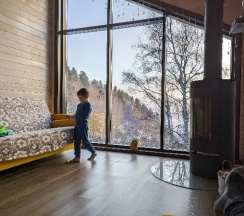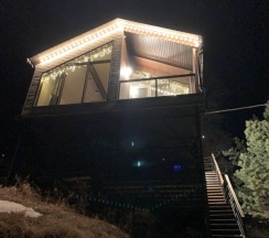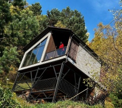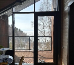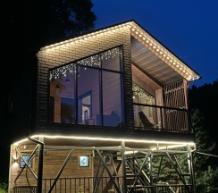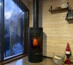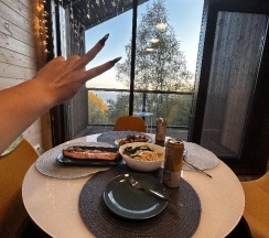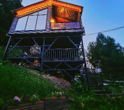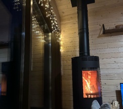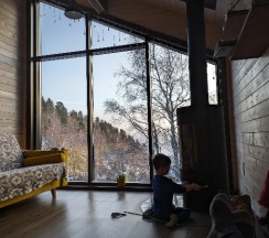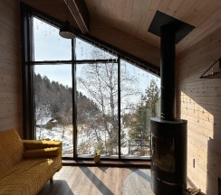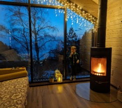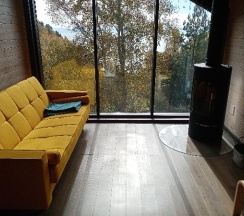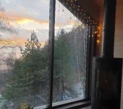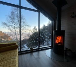 Потрясающий домик! Окна в пол меня поразили… Теплая печка, мягкие кровати, удобная маленькая кухня, уютные комнаты. Вид из окна в люое время прекрасен. Ночью очень хорошо наблюдать за звезламт с балкона. Домик расположен на горе, поэтому можно как посидеть в тишине, так и повселиться на славу. Однлзначно советую 👍🏻