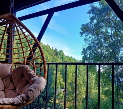 Домик идеально подходит для семьи из 3-4 человек, если вас двое - комфорта будет с избытком. Хорошо оборудованная кухня, балкон, гостиная с камином, удобная двуспальная кровать, раскладной диван, ванная с качественным душем, феном и туалетными принадлежностями. Ещё есть терраса с подвесными качелями и мангал.