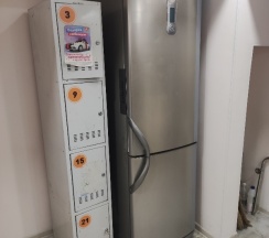 Есть всё необходимое для проживания: кондиционер, шкафчик для хранения ценностей, стол,стулья (можно покушать в комнате), раковина помыть посуду, чайник, микроволновка, холодильник, стиральная машинка, душевая, туалет. На другом этаже есть так же полноценная кухня, где можно приготовить еду.