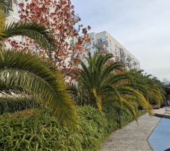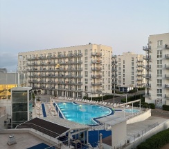 Очень понравился этот комплекс зданий, целый квартал. Мы жили в корпусе J номер 613. Очень просторный номер с двухспальной кроватью, односпальной, диваном и креслом. В ноябре в номере было очень тепло. Спали с открытым балконом, наслаждаясь морским воздухом. Вид на море и горы. Самолеты особо не мучили, окна выходили в противоположную сторону. И ночью не летали, только утром начинали. Номер убирали исправно. Из принадлежностей меняли - полотенца, т бумагу, шампунь и гель для душа. Территория красивая с растениями и бассейном с подогревом.