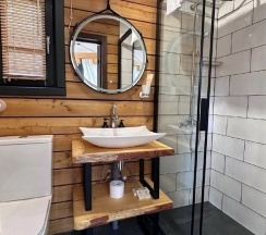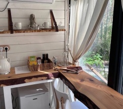 Домики маленькие, но уютные. Да, есть сложности с размещением, если много одежды 😁. Есть посуда, чайник с чаями. Воспользовалась медом, батончиками. Цены разумные.