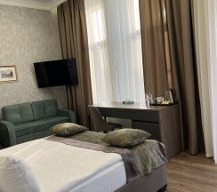 Просторный номер полулюкс с 1 двухспальной кроватью 160*200 и уютным двухместным диваном. Балкон. Изюминка этого номера -это великолепный вид из окна на центральную улицу города. В номере: ванная комната с душевой кабиной, косметика, телевизор, интерактивное телевидение , шторы блэкаут, сейф, утюг, гладильные принадлежности(по запросу), мини-холодильник, чайная станция, Wi-Fi. Дополнительное место в номер устанавливается по предварительному запросу. Завтрак включен