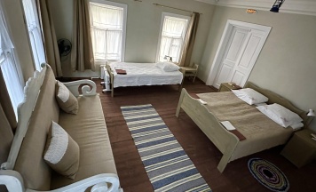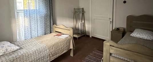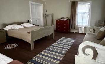 Комната площадью 28 кв.м. оборудована двумя кроватями - односпальной и двуспальной. А также отоплением для комфортного проживания. Ванная и туалет общие