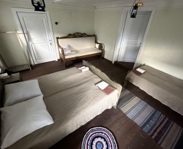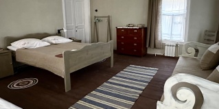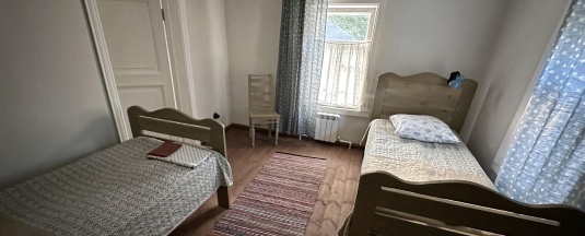Комната расположена на мезонине и оборудована двумя кроватями: двуспальной и односпальной. А также отоплением для комфортного проживания. Санузел общий