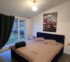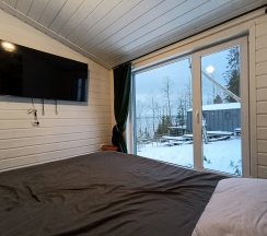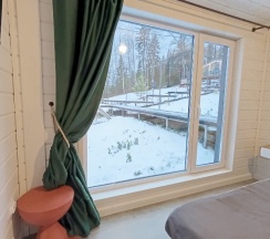 Уютный глемпинг, с чистым домиком в современном дизайне. Из гостинной открывается прекрасный панорамный вид на реку. Очень понравился чан с аппельсиново-пихтовой заправкой. Рекомендуем для спокойного расслабляющего отдыха