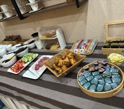 Порадовал завтрак : 1 сет на выбор + кексы, круассаны, 2 вида колбасы, масло, джем, кофе, хлопья, молоко, огурцы и помидоры.