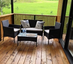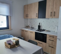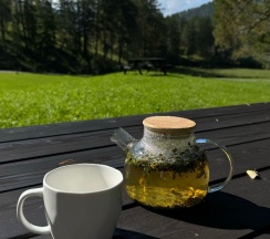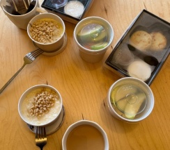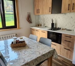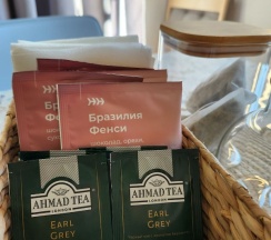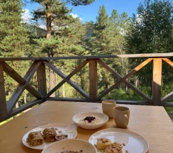Готовили мы сами, но один раз все же заказали завтрак. Блинчики с брусничным джемом, сырники, каша с кедровыми орехами - очень вкусно! Приятно, что и о любителях кофе здесь позаботились, и травяной чай положили.