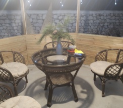 Дом в котором мы жили был оснащен всем необходимым для комфортного отдыха.В нашем домике был душ, туалет, холодильник, плита, микроволновка,чайник, телевизор, полы с подогревом, комплект полотенец для каждого, чистое постельное бельё, удобные матрасы и подушки, тёплые одеяла(все чистое и белоснежное).Во дворе беседки, мангалы, качели,баня, парковка под видеонаблюдением.