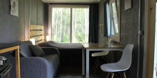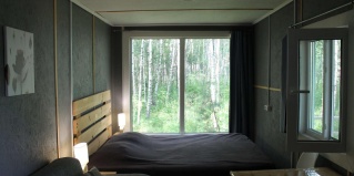 Модуль на двоих. Минимализм, много света, огромное панорамное окно с видом в лес. Собственная терраса с шезлонгами и мангал.