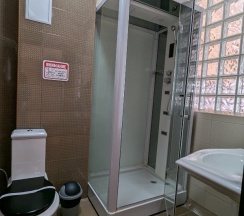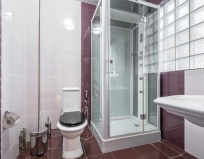 В ванной комнате душевая, белоснежные полотенца: банные — на всех, 1 полотенце для рук и 1 коврик для ног, мыло, шампунь, гель для душа.