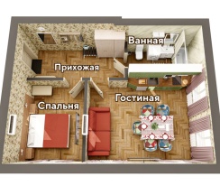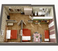 ▪️ Зонирование апартаментов-студии: прихожая+зона кухни со столом+зона спальни с двуспальной кроватью (или 2 односпальными), санузел.