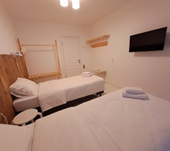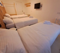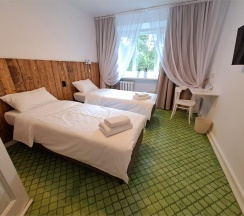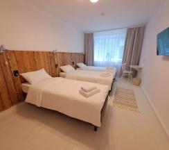 В номере есть всё необходимое для комфортного проживания: три односпальные кровати, стойка с плечиками, стол, стул, светонепроницаемые шторы, держатели для горнолыжного оборудования, тапочки. Также к вашим услугам телевизор со Smart-tv, обогреватель, сушилка для обуви.