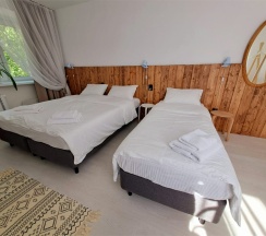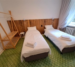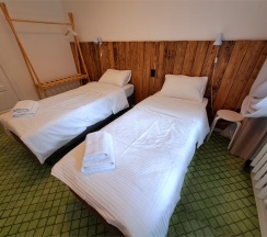 В номере есть всё необходимое для комфортного проживания: две удобные односпальные кровати, стойка с плечиками, стол, стул, светонепроницаемые шторы, держатели для горнолыжного оборудования, тапочки. Также к вашим услугам телевизор со Smart-tv, обогреватель, сушилка для обуви.
