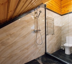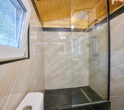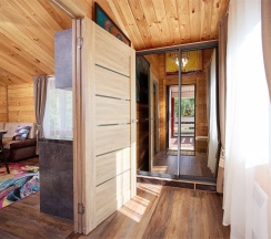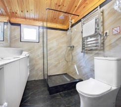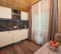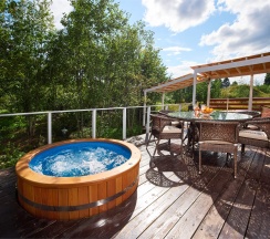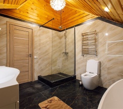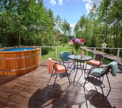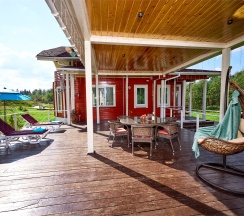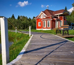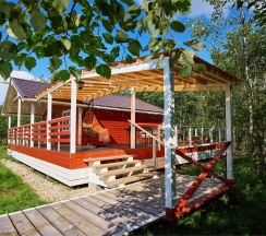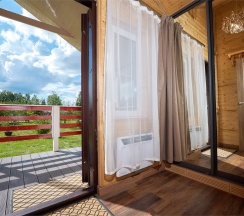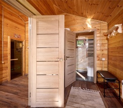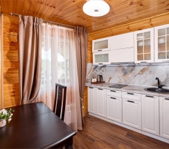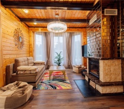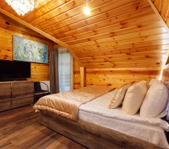 Изысканный деревянный двухэтажный дом для проживания в любое время года для компании из 6 - 8 человек. Большая крытая веранда располагает к отдыху около дома на открытом воздухе, возможно пожарить шашлык и сервировать большой стол на улице. По Вашему желанию, наш персонал подготовить уличную купель на дровах, которой можно воспользоваться как летом, так и зимой. Номера в доме оборудованы кроватями с премиальными матрасами и выбором подушек. Каждый номер имеет свой туалет с ванной или душевой кабиной. Возможен номер с балконом и видом на лес и частично на озеро. В номерах шкаф для хранения одежды и все необходимое для полноценного отдыха. Полноценная кухня позволит Вам приготовить Ваши любимые блюда и сервировать стол внутри дома. Камин в зале придаст отдыху нотки романтики и тепла. Комфорт и все удобства на природе!