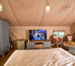 Наша палатка оборудована туалетом и ванной комнатой с горячей водой и шикарной Итальянской ванной. Удобная большая кровать с постельным бельем 5***** , премиальным матрасом и подушками Аскона.